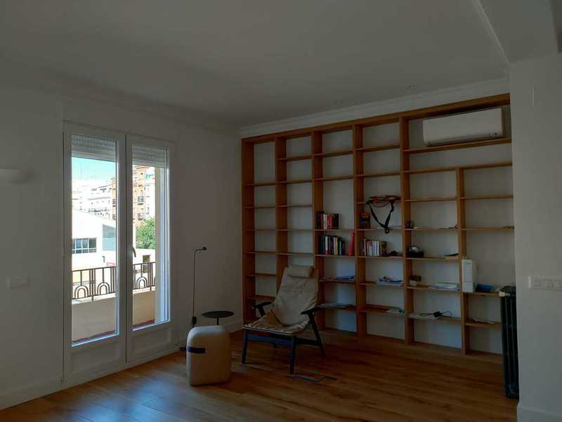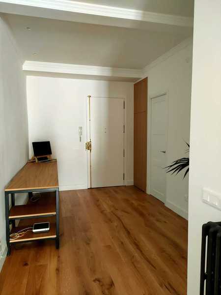 Como primera actuación se decidió crear un gran vestíbulo de entrada donde ubicar una cómoda zona de trabajo que conectase visual y físicamente con la zona exterior de la casa. Con el ensanchamiento del angosto pasillo original se aprovecha al máximo la luz natural de las dos ventanas existentes.