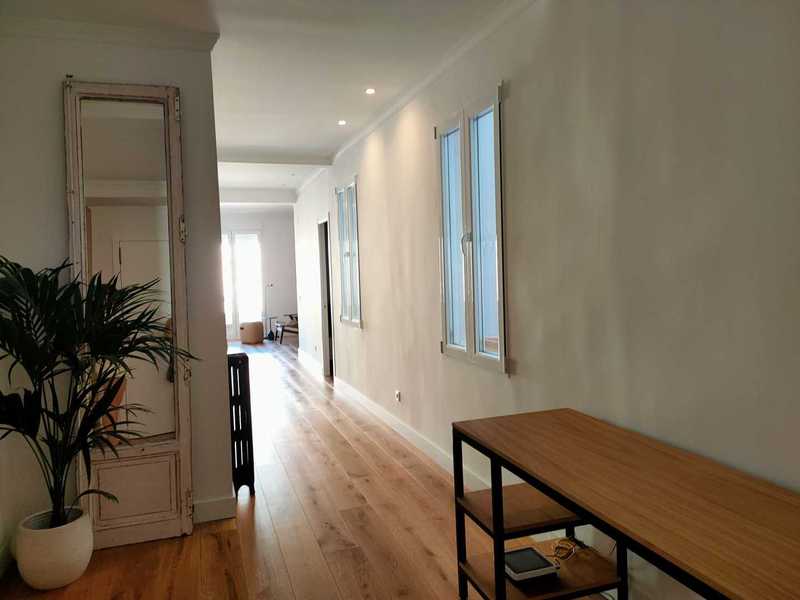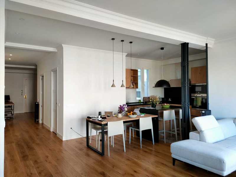Los acabados elegidos, sencillos y neutros, conviven con elementos originales del edificio, de carácter más clásico como pilares estructurales, radiadores y molduras.