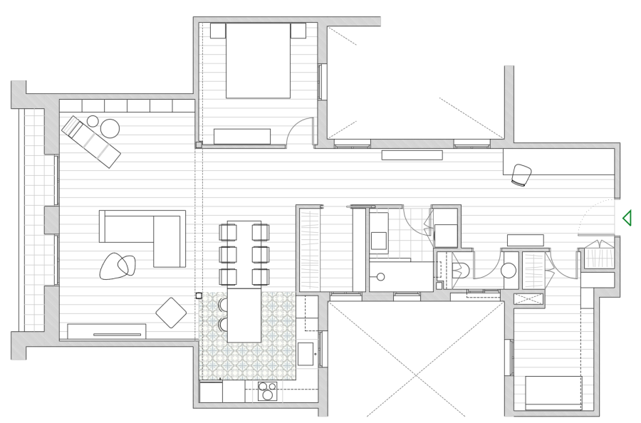 Esta área de paso da acceso a distintas piezas de la vivienda desembocando finalmente en la zona exterior en la que se ubica el estar, la zona de trabajo-lectura, el comedor y la cocina. Esta gran estancia, con frente a un balcón corrido, está bañada por la luz natural que recibe desde tres ángulos distintos.