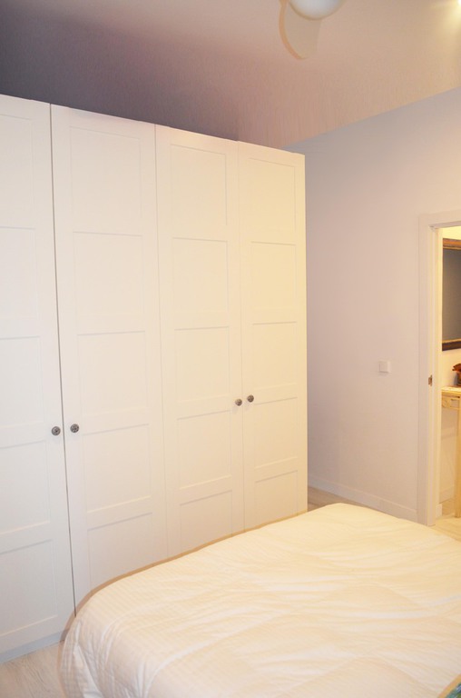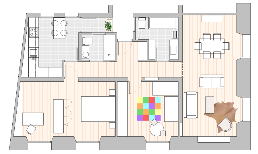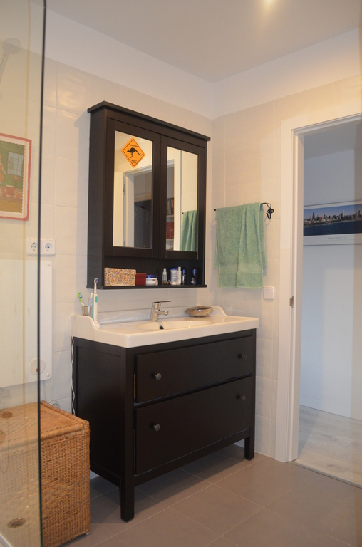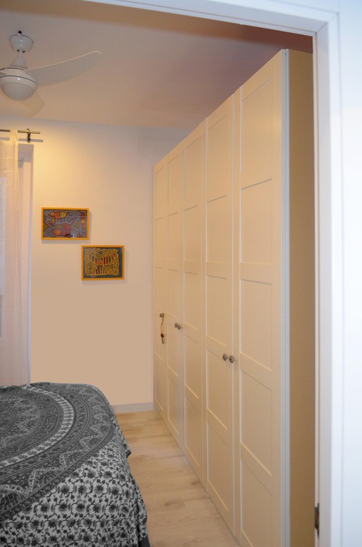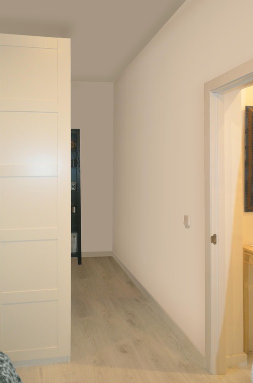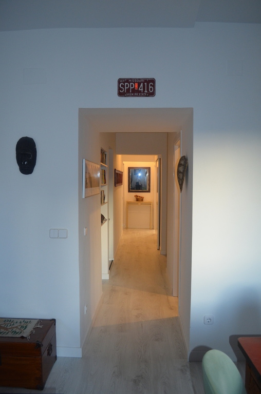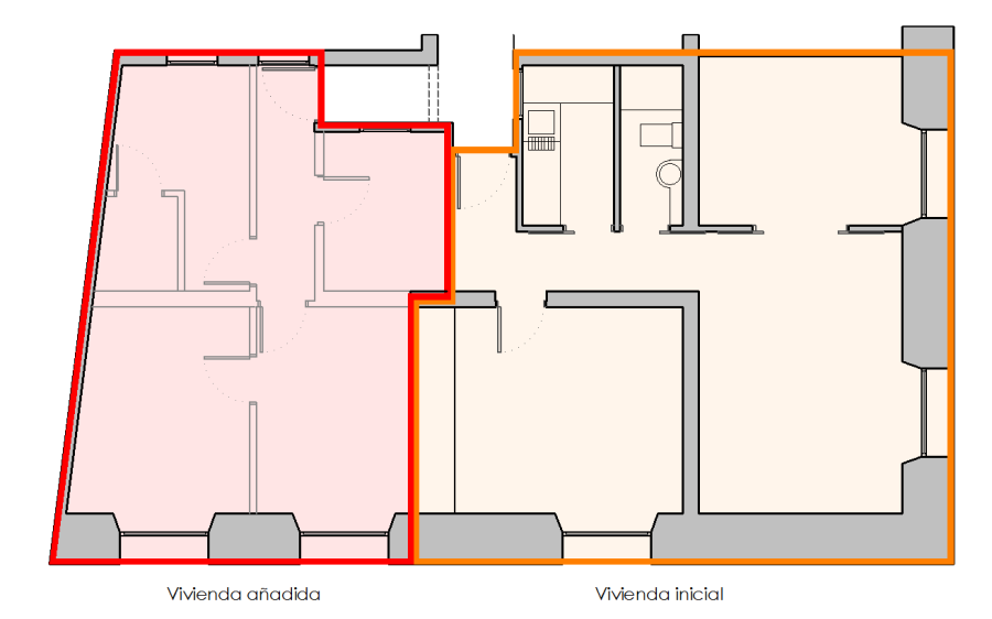 Para ello se realizó una intervención mínima en los espacios de la vivienda en la que ya residían, ubicando un gran baño en el área que anteriormente ocupaban baño y cocina. En la vivienda recién incorporada se realizó una reforma integral, redistribuyendo el espacio para ubicar una gran cocina con zona para comer, un segundo baño, un dormitorio y un despacho.
