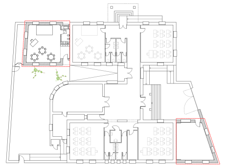 El otro aula, de carácter polivalente, se ubicó en la entrada prinicpal al recinto, situada a una cota inferior con respecto a la edifacación existente, sin afectar