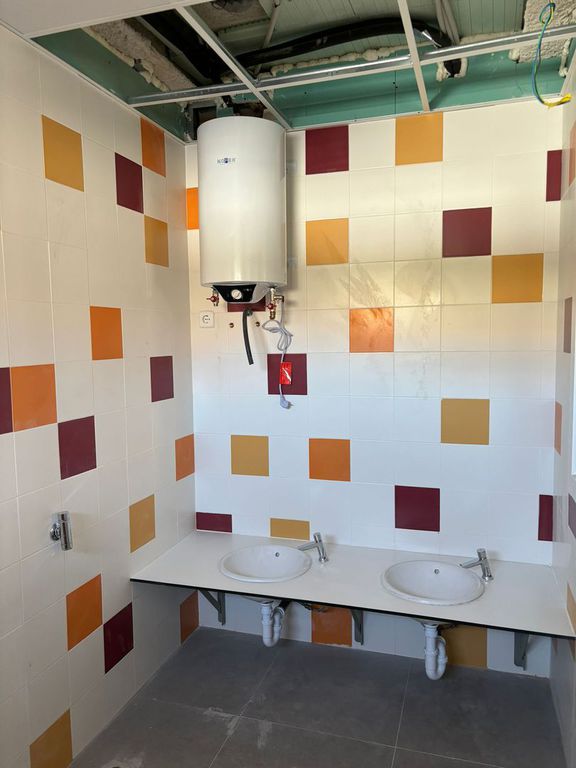 transición que permitiese adaptar las cubiertas entre edificio existente y nuevo. En esta pieza de transición se ubica la entrada al aula, con acceso directo desde el patio, y un aseo de uso