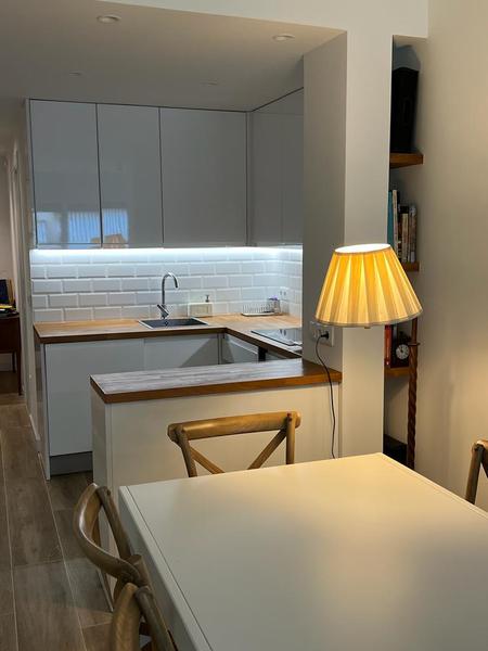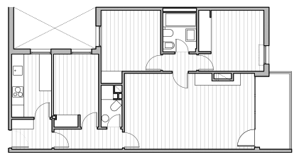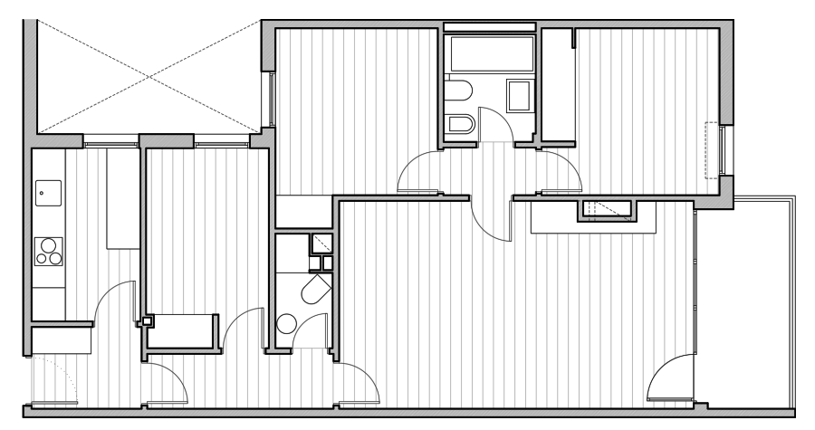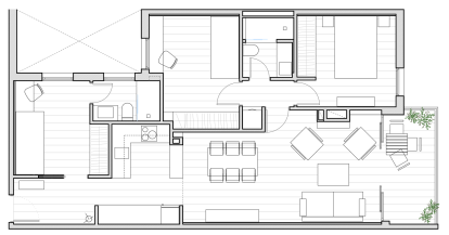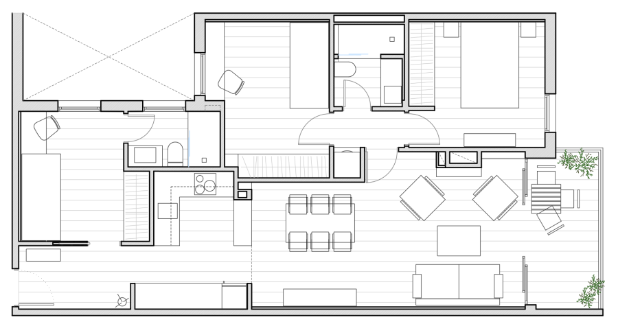 Se decidió crear una única zona de día, que reuniese en el mismo espacio la cocina, el comedor y el salón, desembocando en la terraza y conectando así todo la pieza con el exterior.