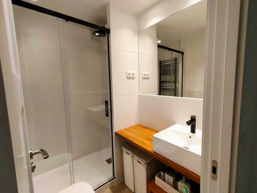 En la entrada a la vivienda, en el espacio liberado por la antigua cocina, se crea un dormitorio con un cuarto de baño completo.