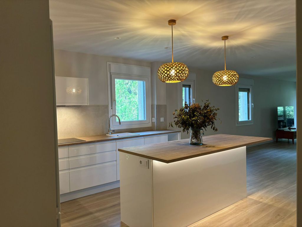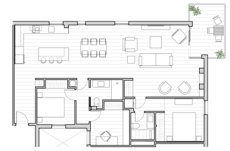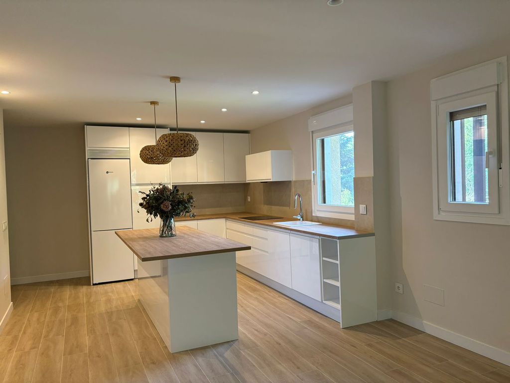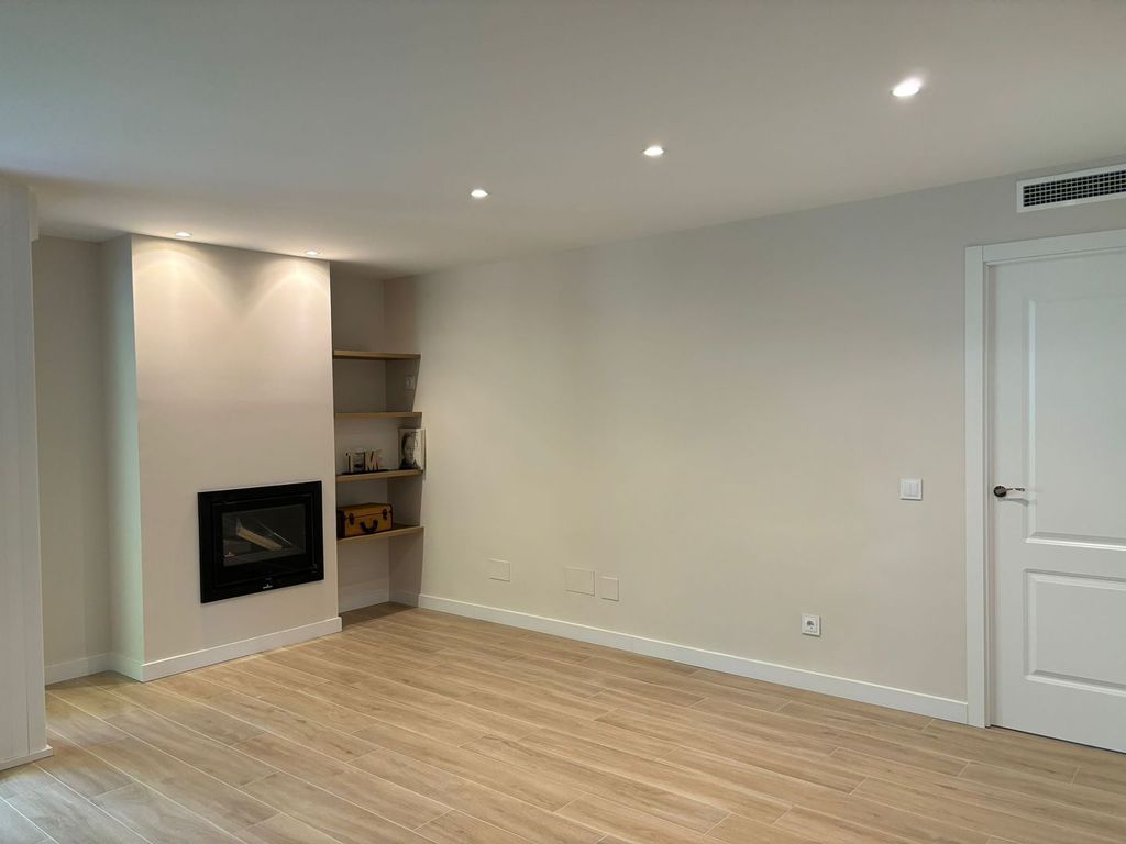 Para ello, la cocina se traslada a esta fachada exterior, formando una pieza única con el estar-comedor, que ocupa el resto de fachada hasta llegar a la terraza. A esta pieza se le da continuidad en forma de L, añadiendo un rincón de estar íntimo en torno a la chimenea.