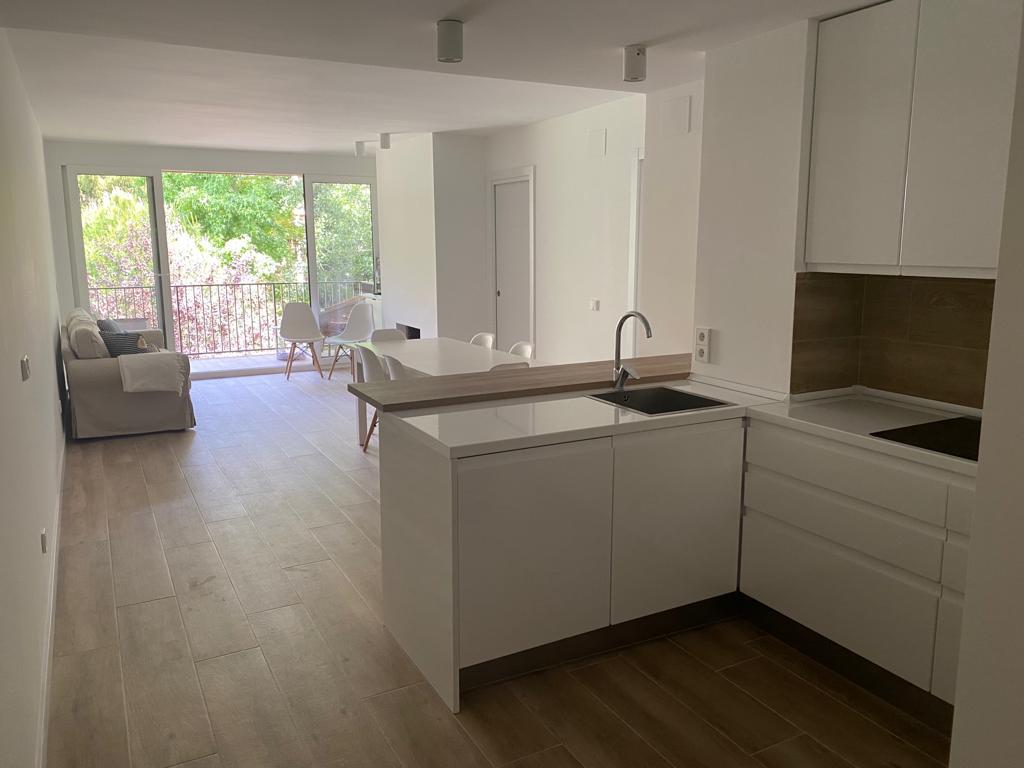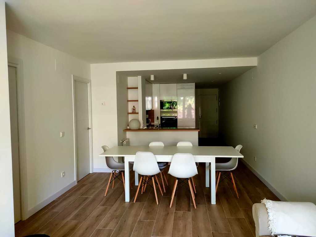 En esta reforma integral se traslada la cocina al centro de la vivienda, integrándola con el salón. La continuidad del pavimento hace que la terraza, situada al final de esta estancia única, se entienda como una prolongación de esta pieza de día (cocina–comedor–estar).