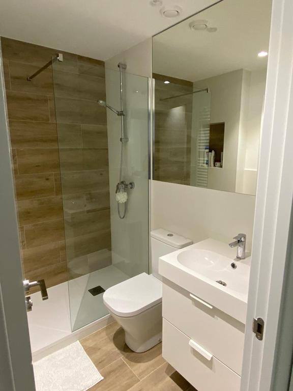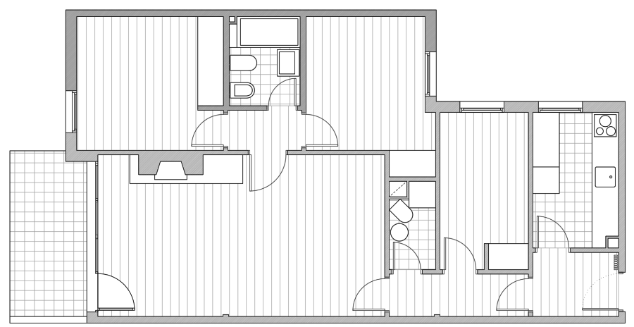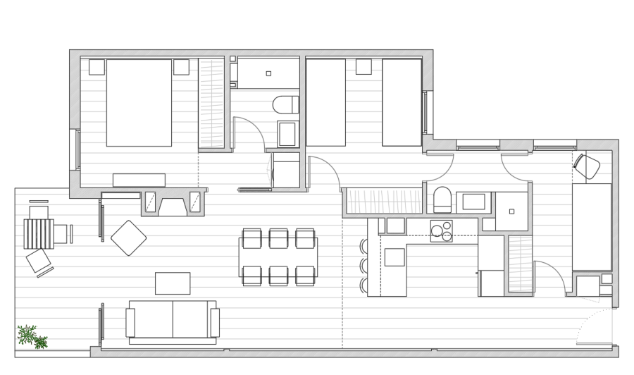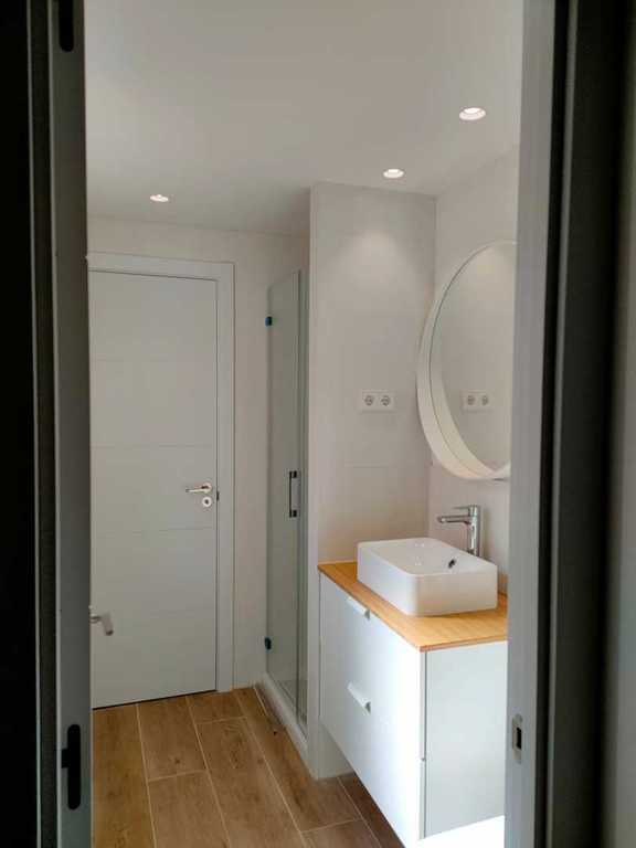 El dormitorio principal de la vivienda mantiene su posición de pieza exterior y se le incorpora un cuarto de baño. A los otros dos dormitorios de la vivienda se les da acceso directo a un segundo baño creado en la zona trasera de la cocina.