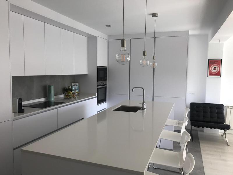 En toda la vivienda predominan las líneas puras y los colores neutros para crear espacios luminosos y amplios. Por su parte, en las estancias que albergan varios usos es el cambio de pavimento el que