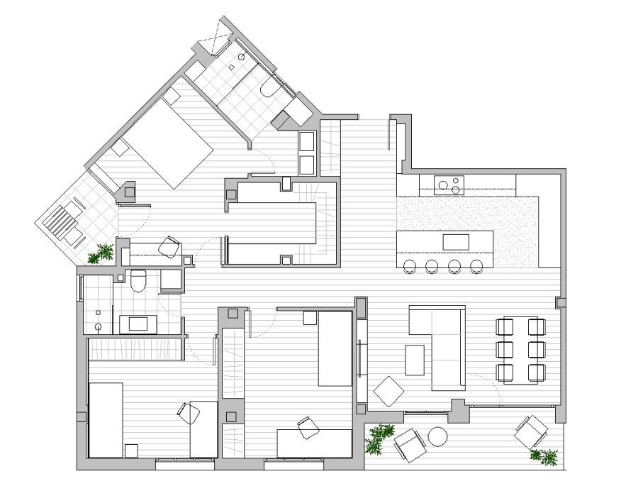 La zona privada de la casa consta de dos dormitorios con baño compartido y un dormitorio principal que incorpora una zona de trabajo, un vestidor y un baño, piezas que ocupan los espacios sin luz natural de la casa. Una terraza privada completa el programa de este dormitorio, confiriéndole un carácter de apartamento autónomo.