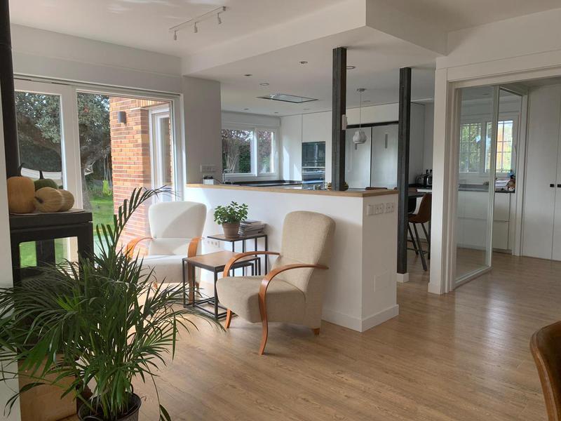 Una mínima ampliación de la casa y una pequeña intervención en la estructura consiguieron darles a los propietarios la cocina deseada. La creación de un rincón de lectura en torno a la chimenea reubicada y la apertura de grandes ventanales, consiguieron cumplir con el programa de necesidades de la propiedad.
