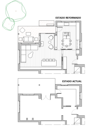 La posición de la cocina original y la estructura portante de la casa limitaban mucho la adaptación del espacio interior existente para conseguir este objetivo.