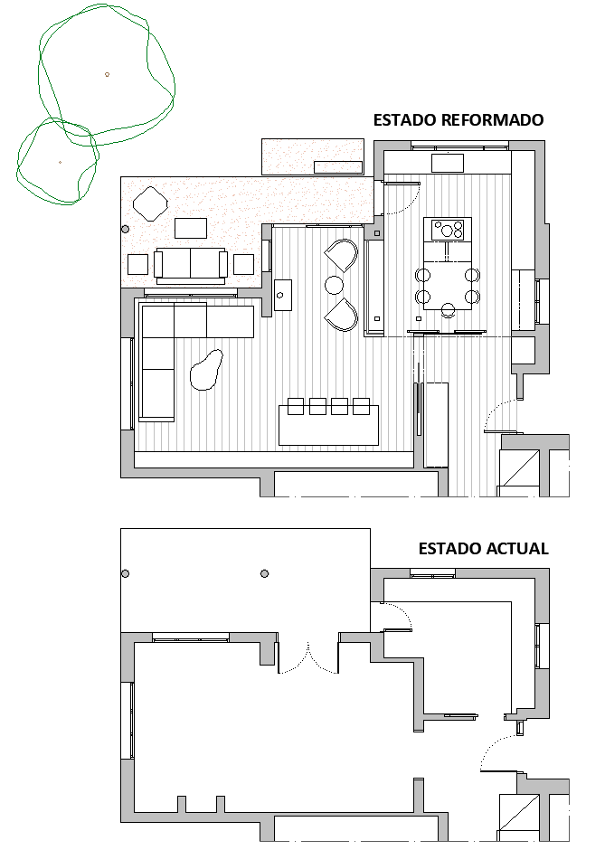 Los propietarios de esta vivienda en la sierra, encantados con su casa, necesitaban una cocina más grande, integrada con el salón y que participase del espacio exterior.