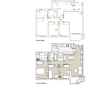 o1. Eliminación del vestíbulo de entrada incorporándolo a un espacio único que será el estar, comedor, lugar de trabajo.